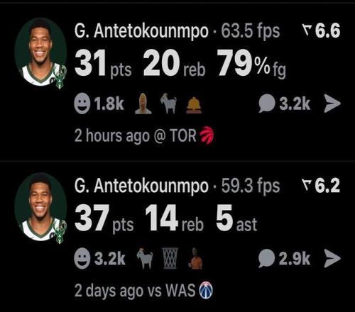 今天字母哥出战38分钟,14投11中,三分球2投全中,得到了31分20篮板7助攻1封盖。夸张的是,20个篮板球里面包括7个进攻篮板。上一次面对猛龙队至少得到30分20篮板的,还是2023年1月份的字母哥。科比在猛龙头上拿到81分,詹姆斯在东部是猛龙队多年苦主,现在又是字母哥。所以,猛龙队是超巨检测器?新赛季揭幕战,字母哥的表现同样夸张,面对奇才队,26投16中,得到了37分14篮板5助攻。两场比赛的命中率全部超过60%,这么一来,新赛季前两场比赛,字母哥以60%的命中率至少得到30分10篮板5助攻,是NBA历史上第一位做到这一点的球员。