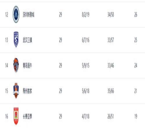 28轮之后,保级形势变得更加明朗,深圳新鹏城、武汉三镇基本完成保级任务。青岛海牛(21分)、梅州客家(20分)、长春亚泰(19分)争夺最后一个保级名额。 在第29轮,率先出战的深圳新鹏城客场0比1负于上海申花,长春亚泰主场0比4负于北京国安,梅州客家则2比2战平大连英博。 梅州客家只拿到了1分,让深圳新鹏城、武汉三镇双双完成了保级任务,这也让保级大战发生了巨大变化。提前保级之后,周日客场对阵青岛海牛的武汉三镇很难全力出击。