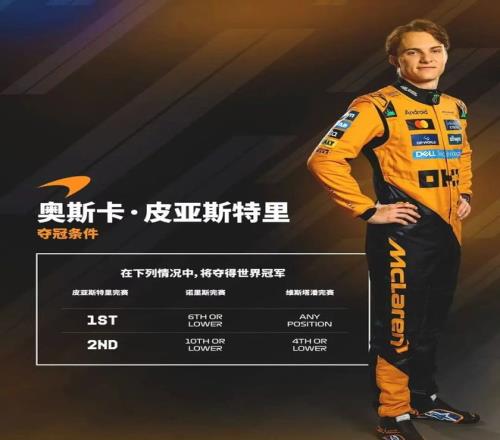 皮亚斯特里则处在最为被动的位置。他必须赢得比赛,同时寄望诺里斯跌出前六名。尽管难度巨大,但理论上仍存机会。这位年轻车手表示:"我没有压力,也没有什么可失去的。"