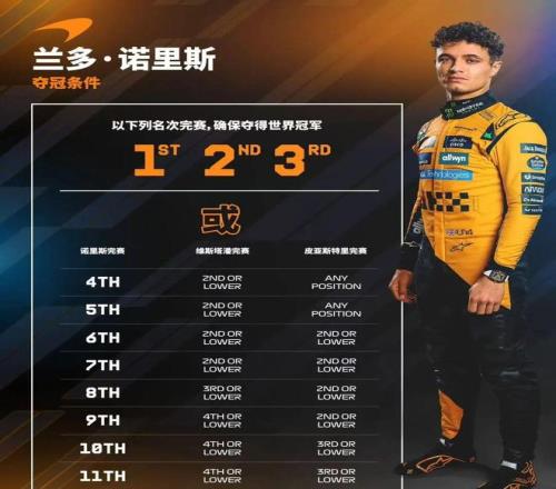 从积分情况看,诺里斯是三人中夺冠形势最好的一位。他只需在阿布扎比取得前三名,即可确保年度冠军。这位英国车手凭借全年的稳定发挥成为现阶段最接近冠军的车手。