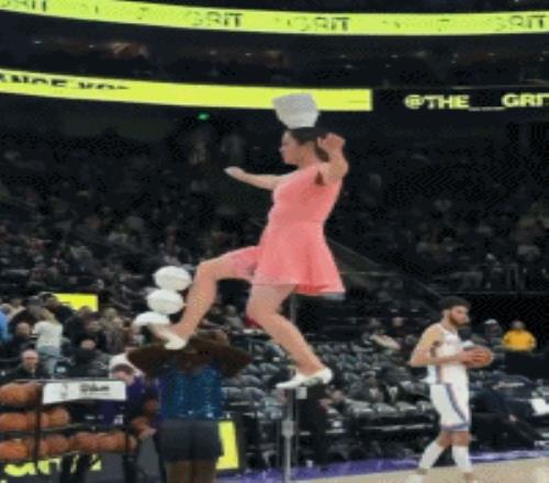 北京时间12月8日,雷霆做客盐湖城与爵士交手,牛大妈今日也恰好来到了这里进行了表演,在这场比赛中场休息期间,有5分钟是属于咱们的牛大妈的,在两米多的独轮车上,牛大妈映衬着《大花轿》的BGM左脚不停地来回踩踏寻找平衡,右脚则将一个个正反不同的大碗摞在一起,随后牛大妈右脚一抖这些正反不一的大碗就像一个个听话的孩子一样落在了牛大妈的头上,无他,唯手熟尔?不,牛大妈是唯脚熟尔。