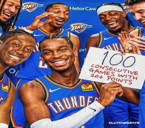 在比赛进行到第四节的时候,雷霆当家球星亚历山大拿到了本场的第20分,这也是亚历山大连续第100场比赛得分上20。